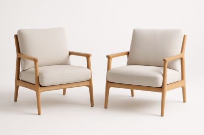 Ensemble de 2 fauteuils en tissu lin crème et bois de chêne