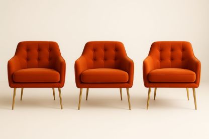 Ensemble de trois fauteuils en velours orange avec pieds en métal